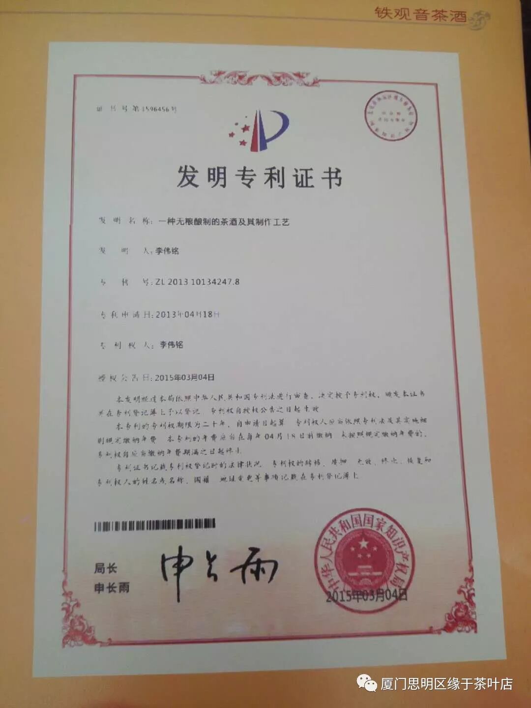 功夫不负有心人,2015年李伟铭先生的铁观音茶酒荣获中华人民共和国专利,2016年6月首批铁观音茶酒面世。