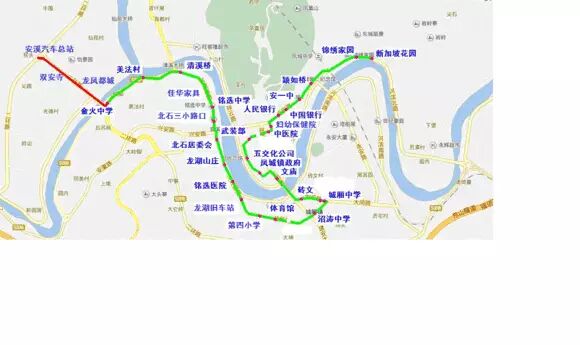 安溪汽车总站、安德物流、双安寺、龙凤都城、金火中学、美法村、清溪桥、佳华家具、铭选中学、北石三小路口、北石居委会、龙湖山庄、铭选医院、龙湖旧车站、第四小学、老干部活动中心(体育馆)、沼涛中学、城厢中学、砖文、文庙、凤城镇政府、五交化公司、武装部、中医院、妇幼保健院、人民银行、中国银行、安一中、颖如桥、锦绣家园、新加坡花园