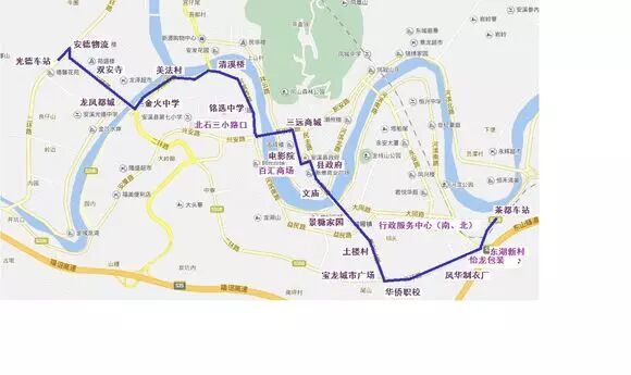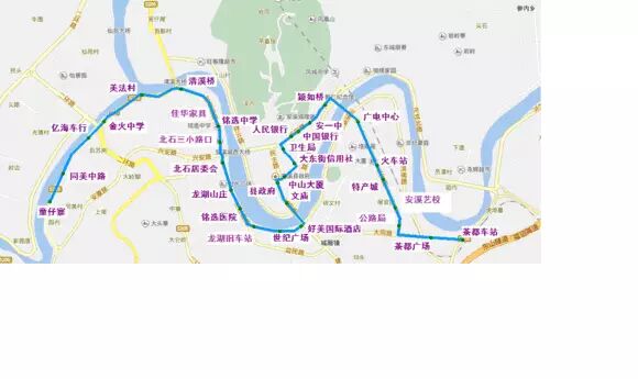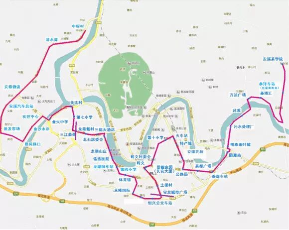 首站:清溪桥 末站:祜水村、茶博汇 (早6:30,晚22:00,3部车辆循环运行)清溪桥、佳华家具、铭选中学、北石三小路口、武装部、电影院、百汇商场、铁索桥、龙津公园、沼涛小学、静心亭、中国银行、安一中、颖如桥、凤城中学、锦绣家园、新加坡花园、茶叶公园、园潭、普陀寺