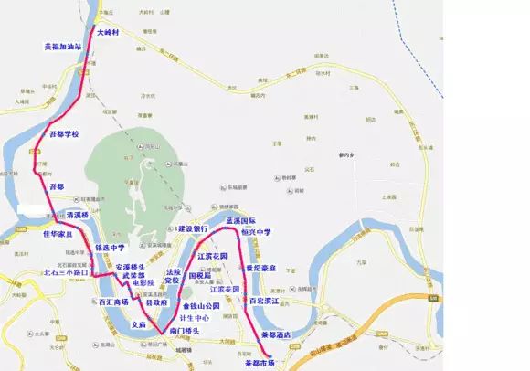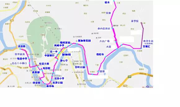 大岭村、美福加油站、吾都学校、吾都、清溪桥、佳华家具、铭选中学、北石三小路口、安溪桥头、武装部、电影院、百汇商场、县政府、文庙、南门桥头、计生中心、金钱山公园、党校、法院、国税局、江滨花园、建设银行、蓝溪国际、恒兴中学、世纪豪庭、百宏滨江、茶都酒店