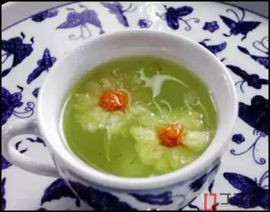做法:将菊花放入水中煮沸,将榨汁的柠檬和绿豆沙的汁注入菊花水中搅拌,放入少量蜂蜜即可饮用。