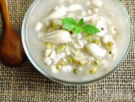 做法:先将金银花煎水,去渣,入绿豆煮至熟烂,再加入红糖,饮汤食豆。