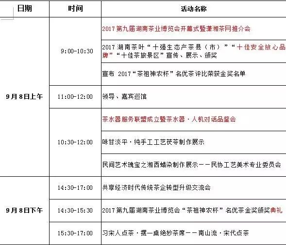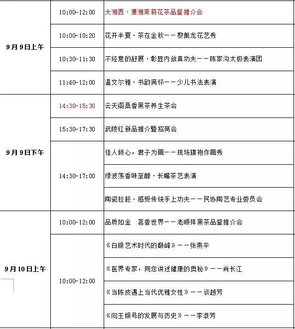 据了解,在为期四天的时间里,还将举办“潇湘杯”首届湖湘斗茶大赛、茶水器服务联盟成立暨茶水器·人机对话品鉴会、大湘西·潇湘茉莉花茶品鉴推介会,首届湖湘茶文化书画精品展、魅力湘茶摄影精品展、第四届湖南“茶与健康”万人广场舞大赛、桂东玲珑茶品鉴推介会、武陵红新品推介暨招商会,经销商和品牌企业现场对接会等十大主题活动。