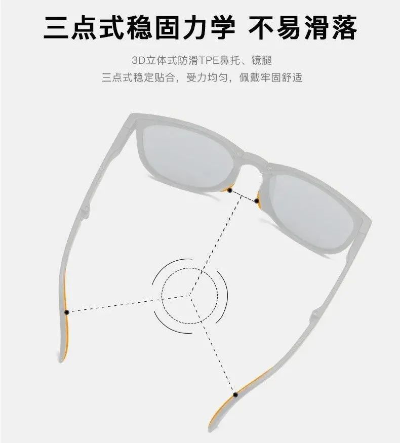 3D立体式防滑TPE鼻托、镜腿,三点式稳定贴合,受力均匀,佩戴牢固舒适。
