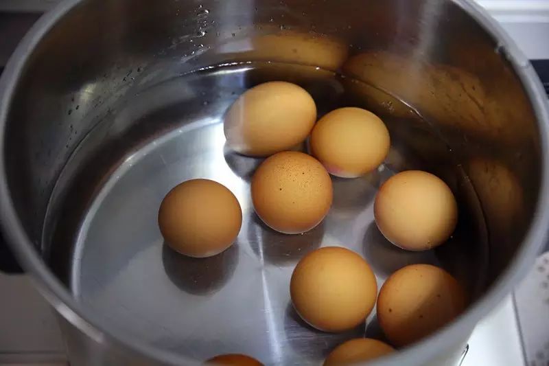 第二步:将鸡蛋清洗干净,然后放入锅中,加入适量的水(水量要没过鸡蛋)。中火烧开水后转小火煮15分钟,然后关火将鸡蛋捞出备用。(全程一定不要用大火,否则容易将鸡蛋煮裂,导致蛋液流出)