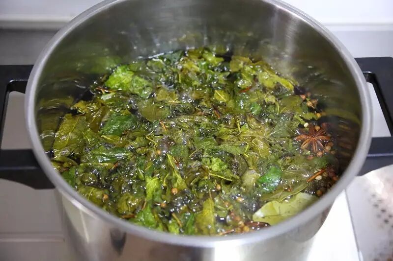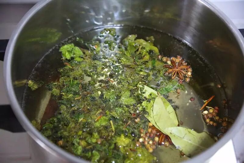 第四步:锅中多倒一些水,然后放入桂皮、八角、花椒、香叶。大火烧沸。(水可以多放一点,要一次加足)