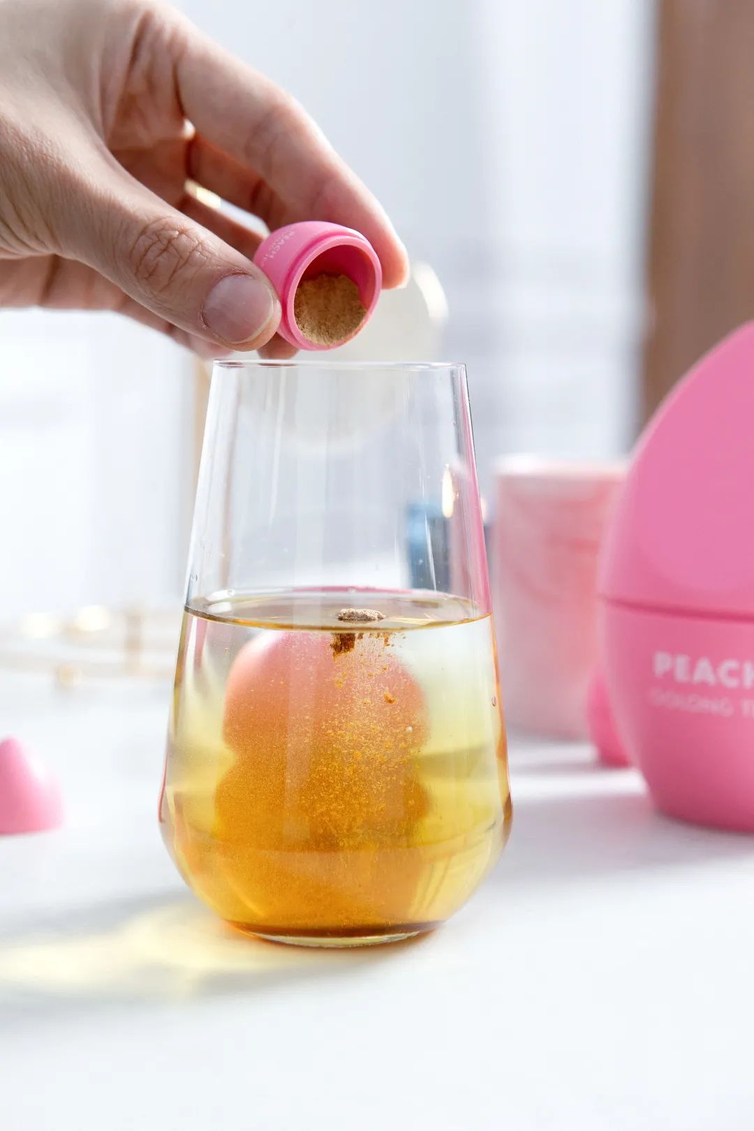 我买得最多的是蜜桃乌龙口味,每年四月前后我都对粉嫩的颜色毫无抵抗力,大概因为这个月樱花桃花是开得最好的,想和自然协调一致?选用的茶叶是福建平和白芽拼安溪铁观音,打开就能闻到浓浓的蜜桃香,早上我爱用热水冲,3秒即溶化,配着早餐吃,一天都萦绕淡淡的香味。下午我更喜欢冷泡加点冰块,一杯自制茶饮就做好了,不管是拍摄还是其它工作,有它陪着,闻着味道就心情舒爽还可以激发头脑清醒,工作效率也跟着提高了。