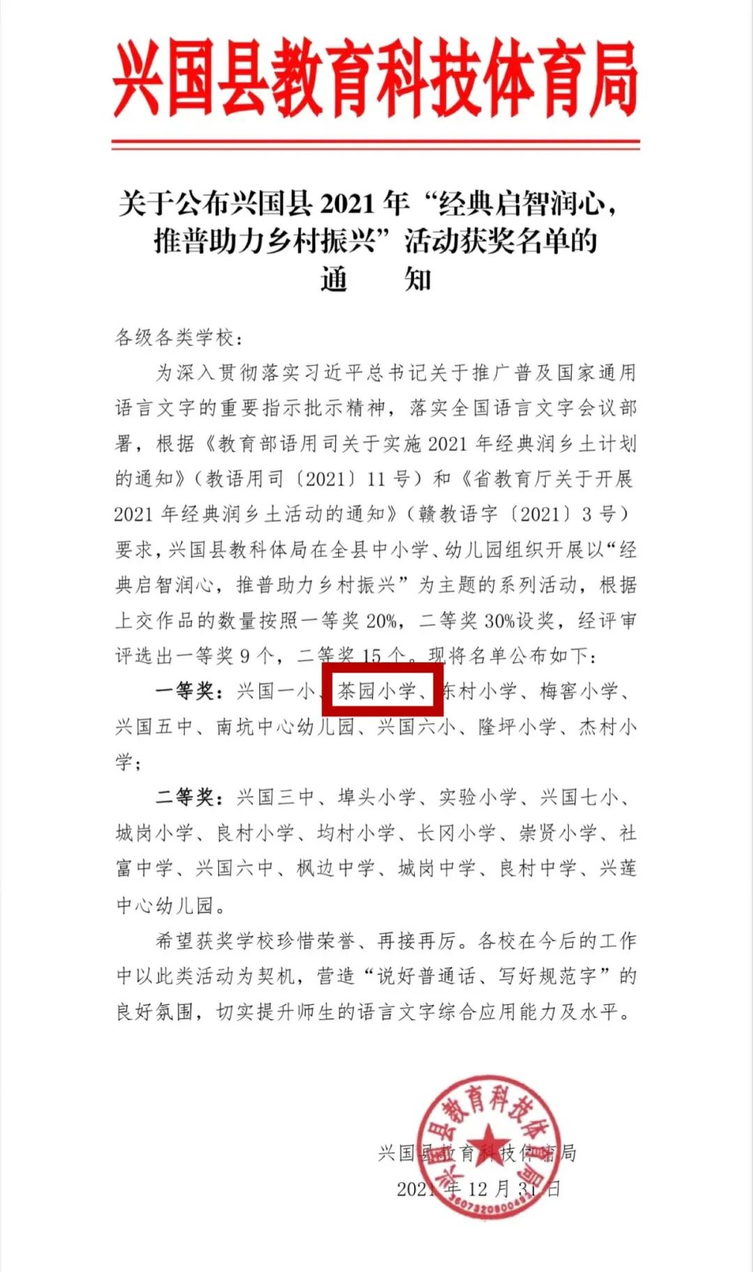热烈祝贺我校在兴国县2021年“经典启智润心,推普助力乡村振兴”活动中荣获一等奖!