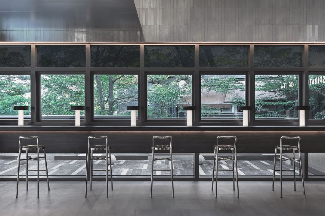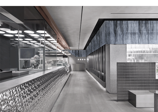 极简银色水纹金属体块吧台,砂岩质地的灰色地面,有序阵列的泡泡灯,同时配合制冰、甜品的明档展示,串联起不同区块的空间趣味性。透过对景的格栅窗,室内与户外相互映衬,达成室内与景观的视觉互动体验。