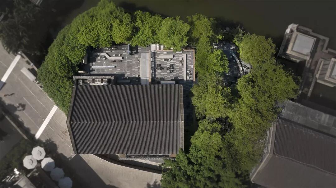 At the entrance, the metal grille facade replaces the solid wall, creating a relaxing atmosphere. And the screen behind it displays the beautiful landscape repeatedly. Here, the art of architecture, modern ink paintings, digital technology as well as the “rain curtain” dialogue with each other and show both the collision and combination between tradition and modernity.