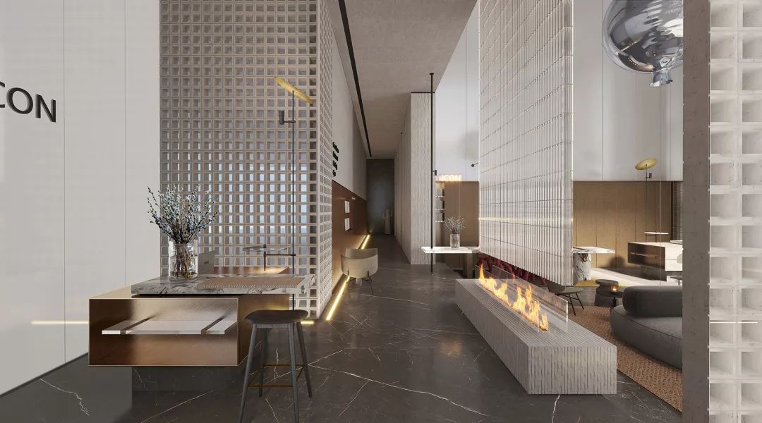 主要材料 | 灰白麻石、银色砂面金属、火山岩、金属肌理砖、岩板、LED透明屏幕