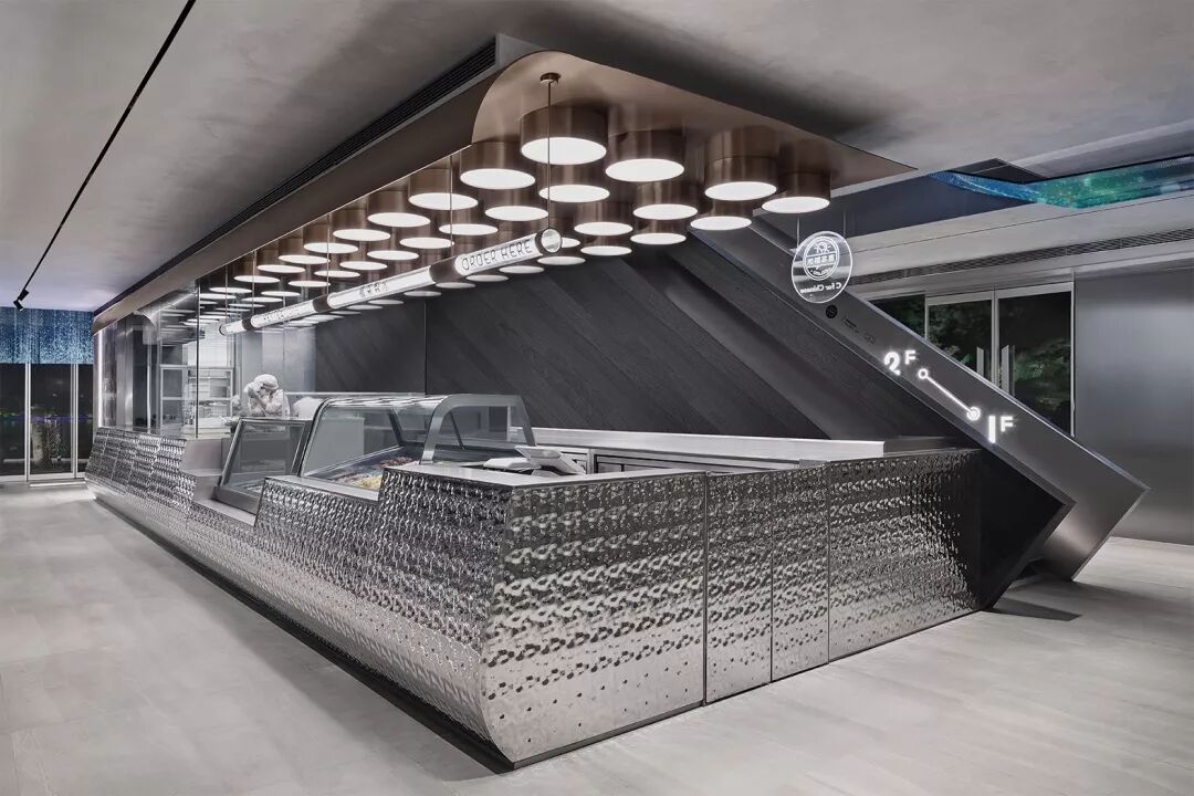 Silver metal bar counter, gray emery floor, and sequential bubble lights as well as the ice-making and dessert displays, connect a series of interesting spaces. At the same time, the floor-to-ceiling glass doors create an interactive visual experience between the interior and the outdoor landscape.