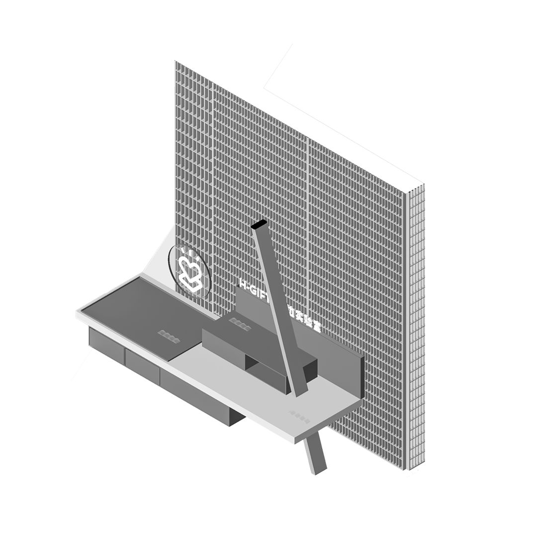 H-GIFT MARKET is located at the entrance to continue the images on the LED facade and to display a variety of peripheral products against the metal grilles.