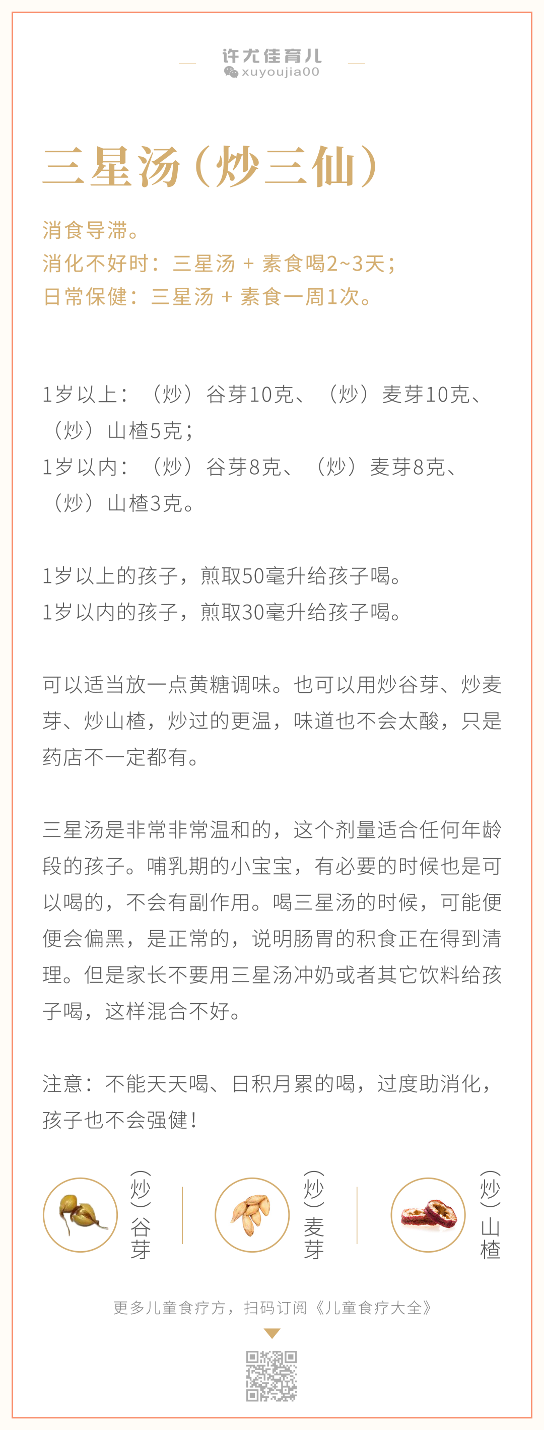 孩子天生脾常不足,脾胃功能比较弱,很容易就会积食。家长可以在每个周末给孩子吃一次三星汤,再配合素食。