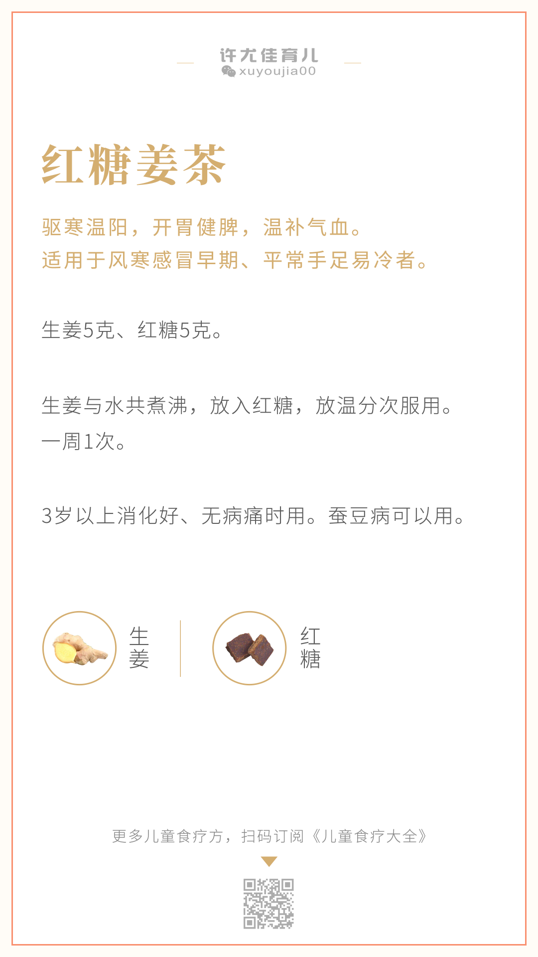 孩子在幼儿园的饮食大多是寒凉的,家长可以观察一下孩子每周的菜单,如果本周寒凉的食物较为集中,可以在周末的早上给孩子喝一杯红糖姜茶,驱散一下寒气。