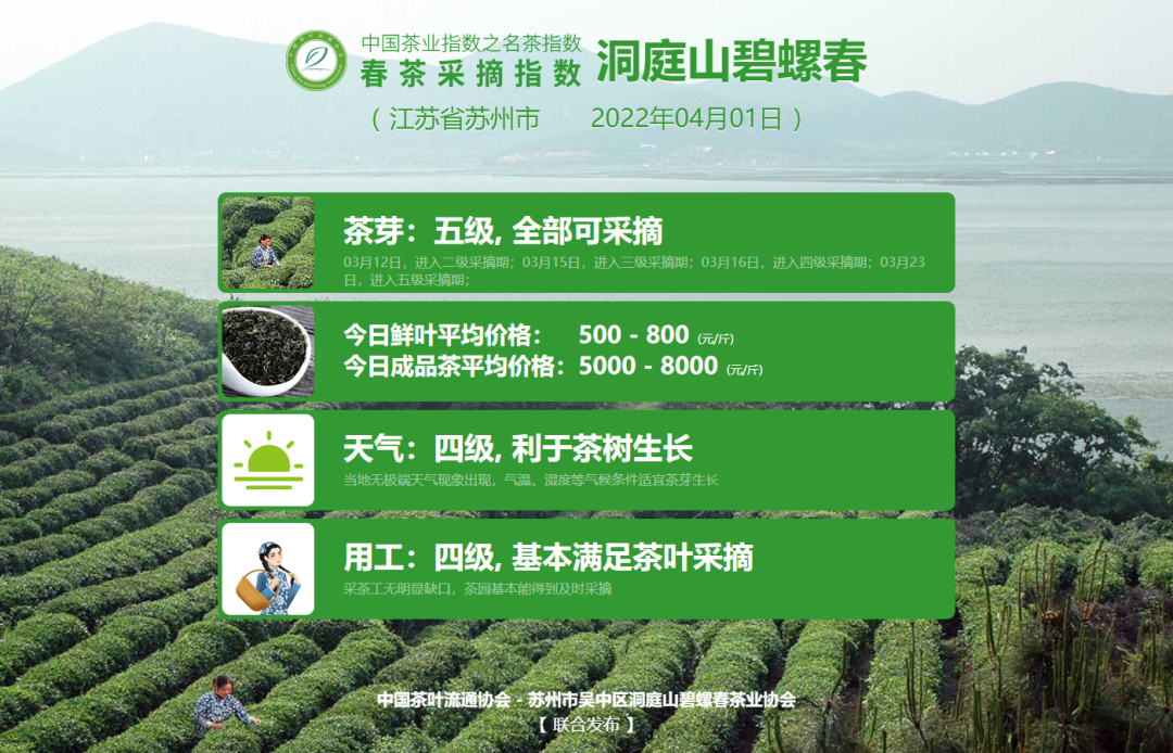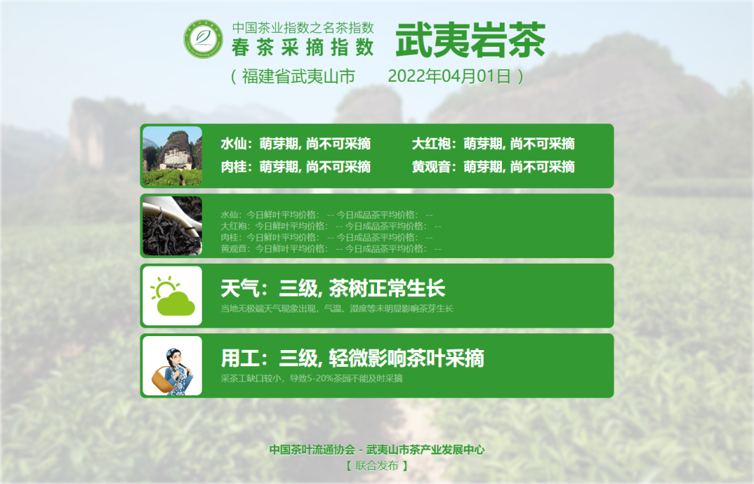为引导广大茶叶消费者科学、安全、理性选购,切实保护名茶原产地生产者和广大消费者的利益,中国茶叶流通协会于2022年继续联合杭州市西湖区龙井茶产业协会等9大名茶产区主管单位于即日起共同发布中国茶业指数之名茶指数——春茶采摘指数(简称:春茶采摘指数)。包括西湖龙井、洞庭山碧螺春、黄山毛峰、信阳毛尖、六安瓜片、太平猴魁、湄潭翠芽、大佛龙井与武夷岩茶。