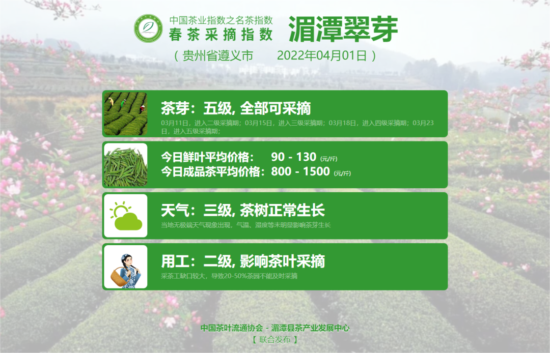 用工方面,各地春采茶工基本充足,湄潭翠芽采茶工缺口问题仍然持续,当地有关部门应及时采取相应措施,协调劳动力资源,满足春茶季用工需求;