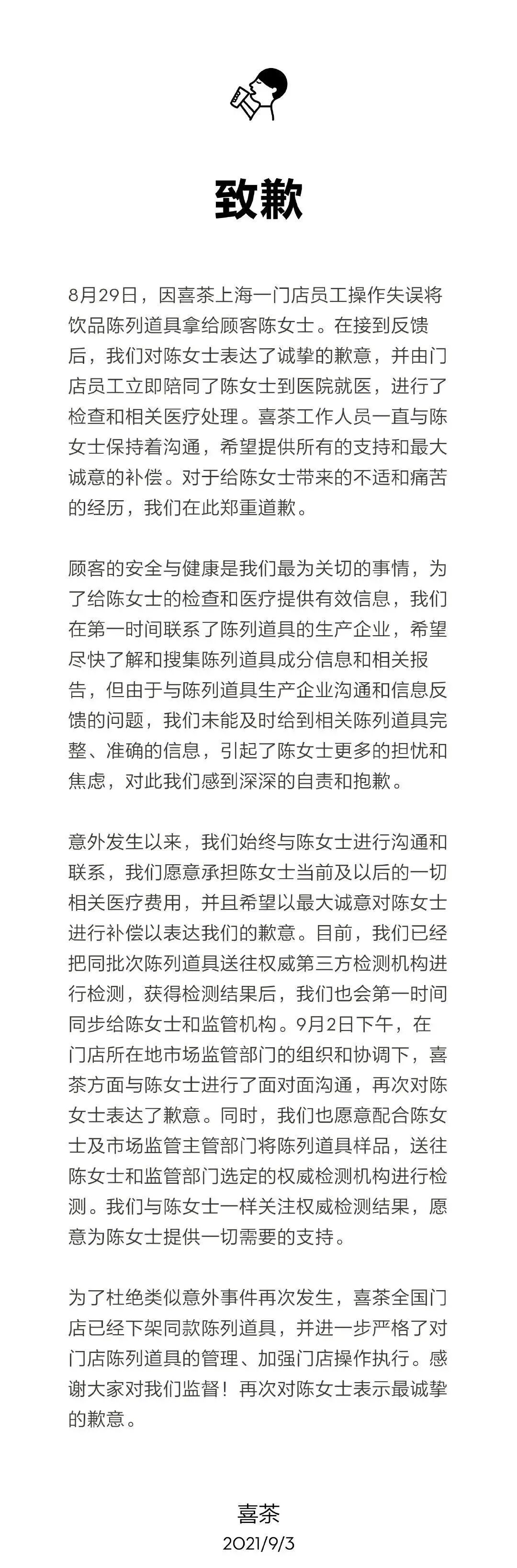 喜茶致歉 在全国所有门店下架同款陈列道具 昨晚,喜茶发文致歉,称上海一门店员工操作失误将陈列道具拿给顾客陈女士,对于给陈女士带来的不适和痛苦的经历,郑重道歉。目前,喜茶已在全国所有门店下架同款陈列道具。食品安全无小事