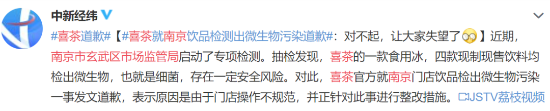 网红品牌“真诚道歉,下次继续”?此前,喜茶也曾多次致歉,称“让大家失望了”:2020年6月,喜茶曾就饮品检测出微生物污染道歉。2019年5月29日,有顾客在喜茶苏州圆融店的外送饮品中喝出苍蝇。2019年1月4日,喜茶西安赛格店被曝“垃圾爆满,环境脏乱差”。