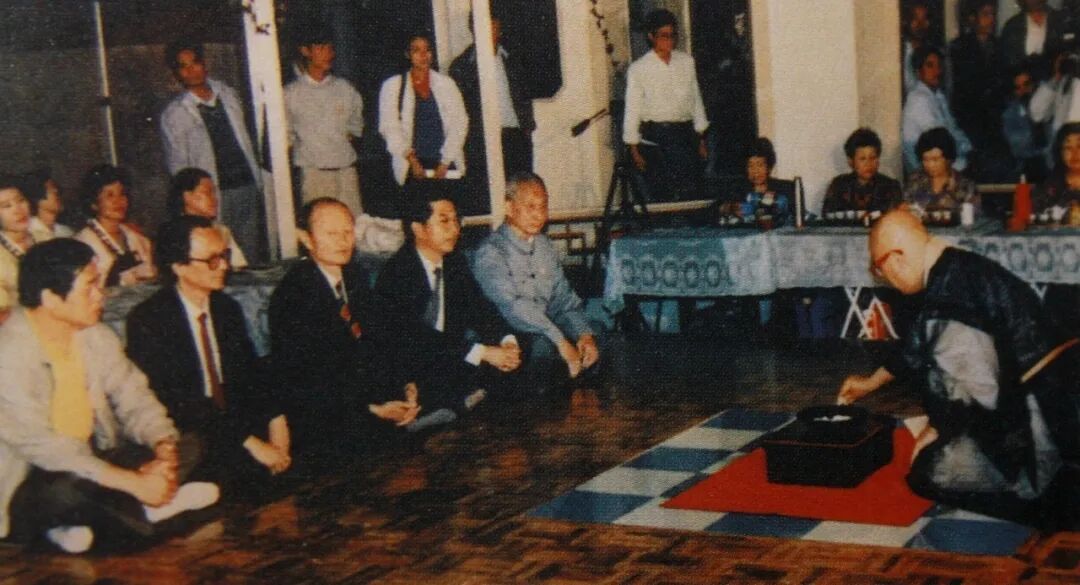 1991年10月14日,张天福代表中国大陆接受日本茶人正木义完献茶,李瑞河(左一)则代表中国台湾接受献茶