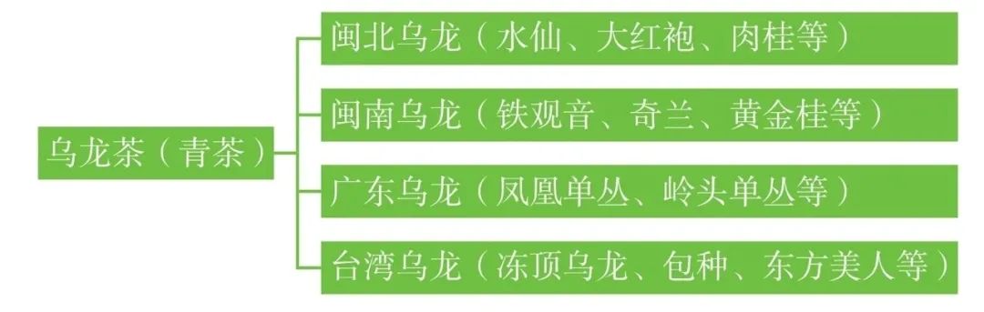 乌龙茶主产区为福建、广东、台湾 3 省,根据产地不同,可分为闽北乌龙、闽南乌龙、广东乌龙、台湾乌龙等 4 大类,各类按照典型产地或茶树品种可再进一步细分。乌龙茶的品质与其茶树品种和产地有密切关系,各种乌龙茶商品名往往以茶树品种来命名,这在其他茶类中并不多见。