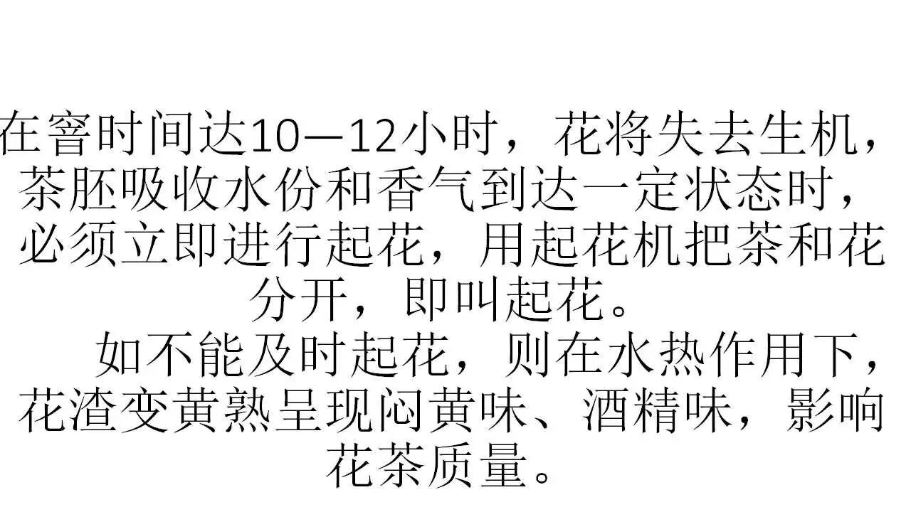 起花操作要迅速,起花后做到茶叶中无花蒂、花叶;花渣中无茶叶。停机后,筛网必须清扫干净,起花后的湿茶要薄摊散热防止水焖味。