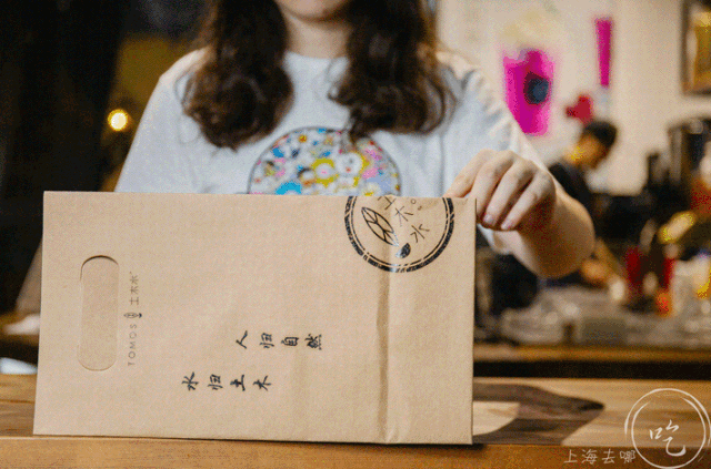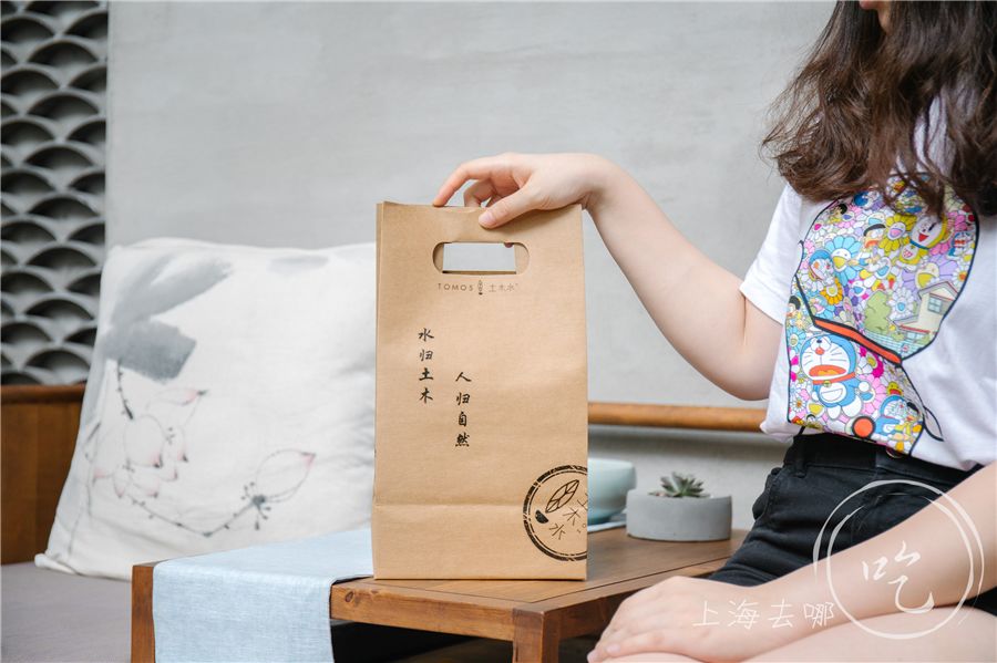 相比很多茶饮店用的塑料外卖店,土木水用的是更环保的纸袋,简单的设计也是凹造型的一把好手。