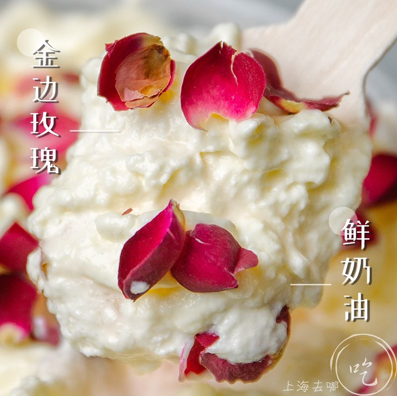 雪顶选用鲜奶油打成,配上可食用的金边玫瑰,口感轻盈似云雾...
