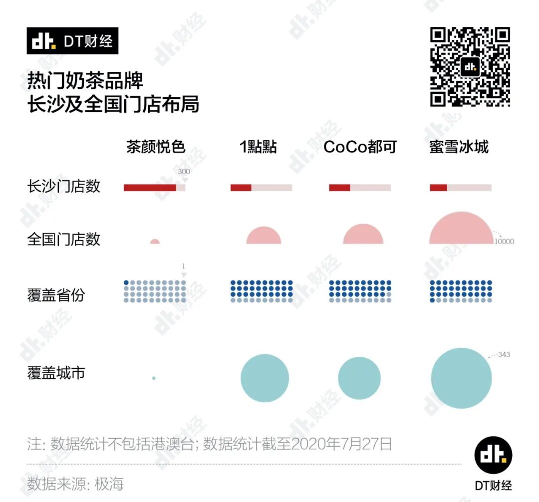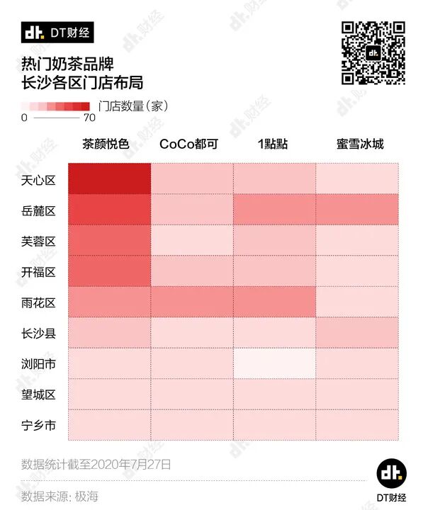 单从门店数量来看,截至2020年7月27日,茶颜悦色在长沙有225家门店,是CoCo和1點點的2.2倍,蜜雪冰城的2.7倍。