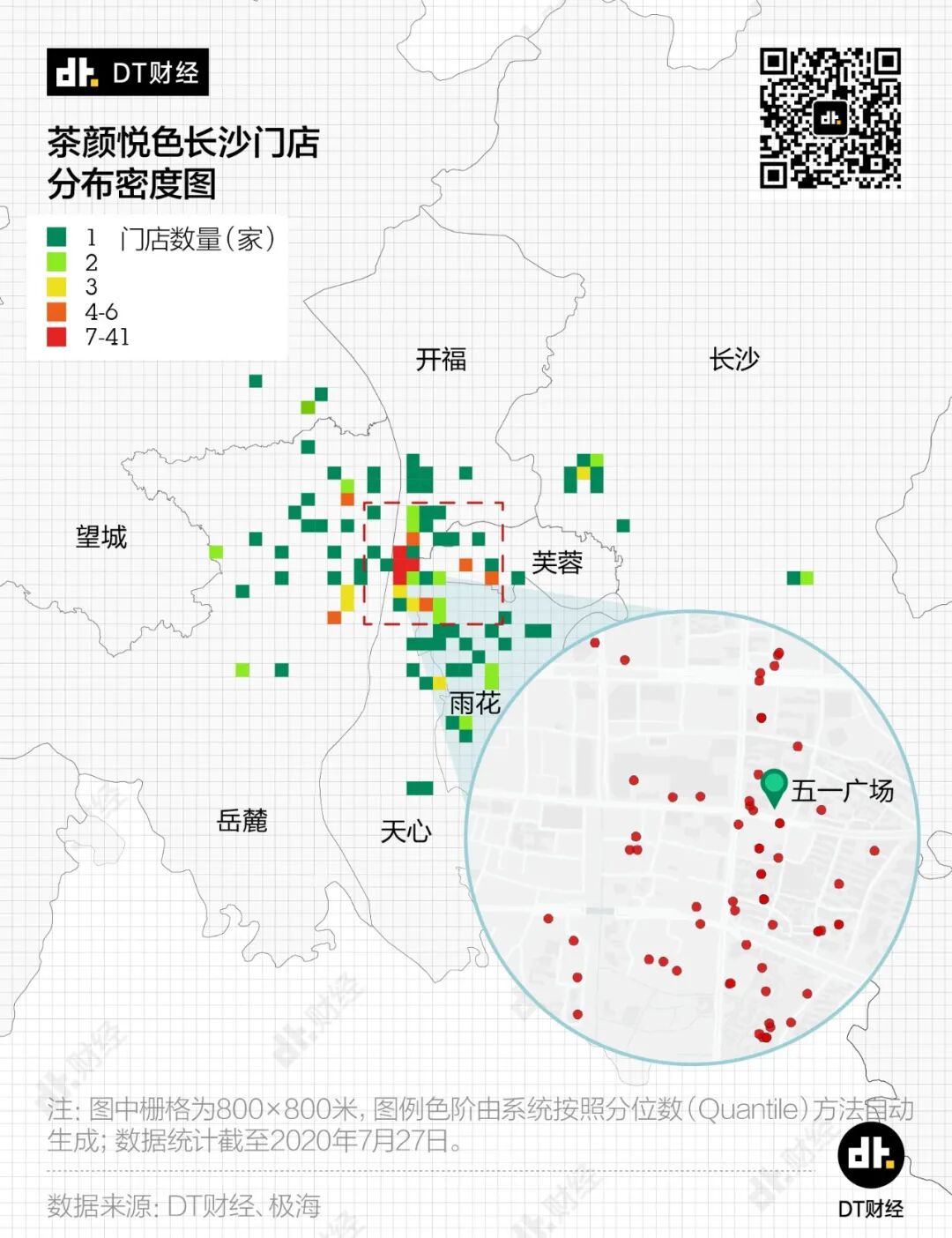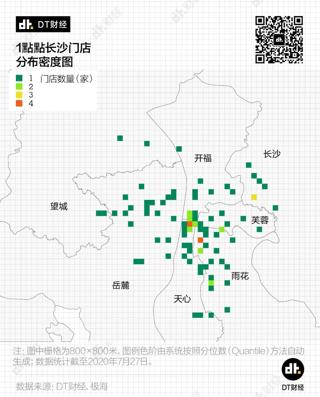 结果发现,一方面1點點在长沙的门店总数不算太多,只有百来家,所以显示在地图上的色块并不多。另一方面,就算在市中心五一广场附近,1點點也只有在2个小方格的门店数量达到了4家。与茶颜悦色的41家相比,1點點在长沙并不那么有存在感。