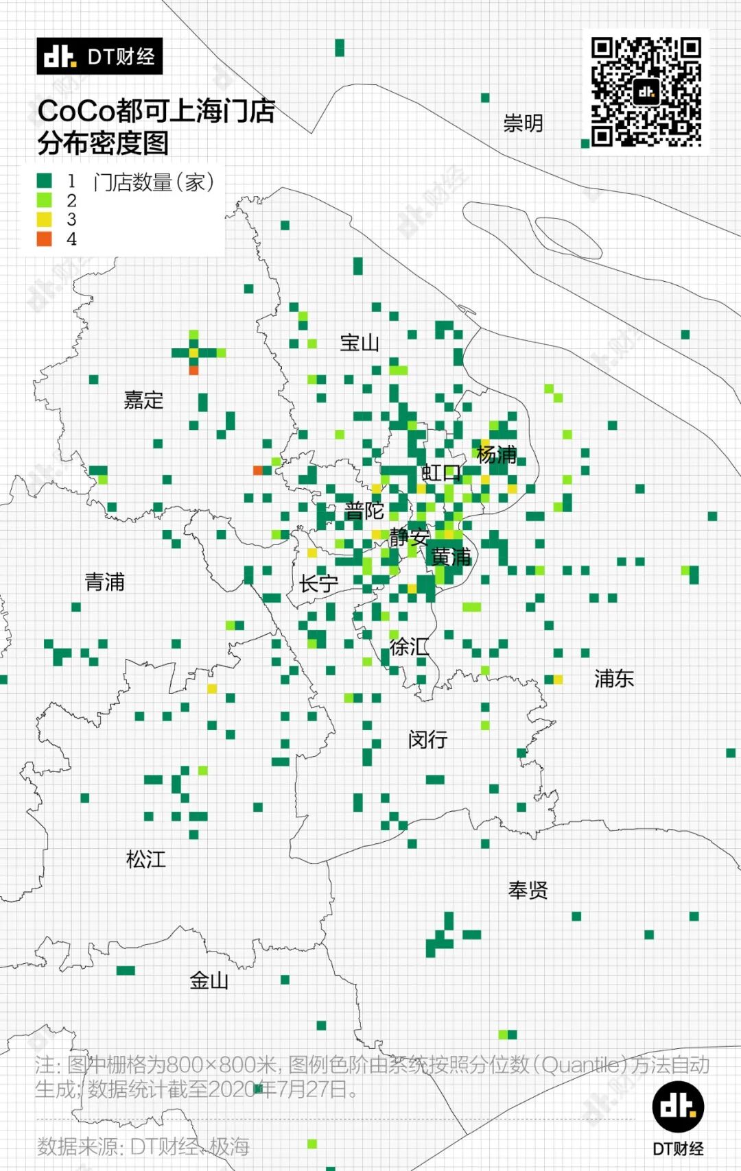 我们再次按照上述办法,把上海分割成数个800米×800米的小方格,并用颜色来区分单个小格子中CoCo都可的门店数量。