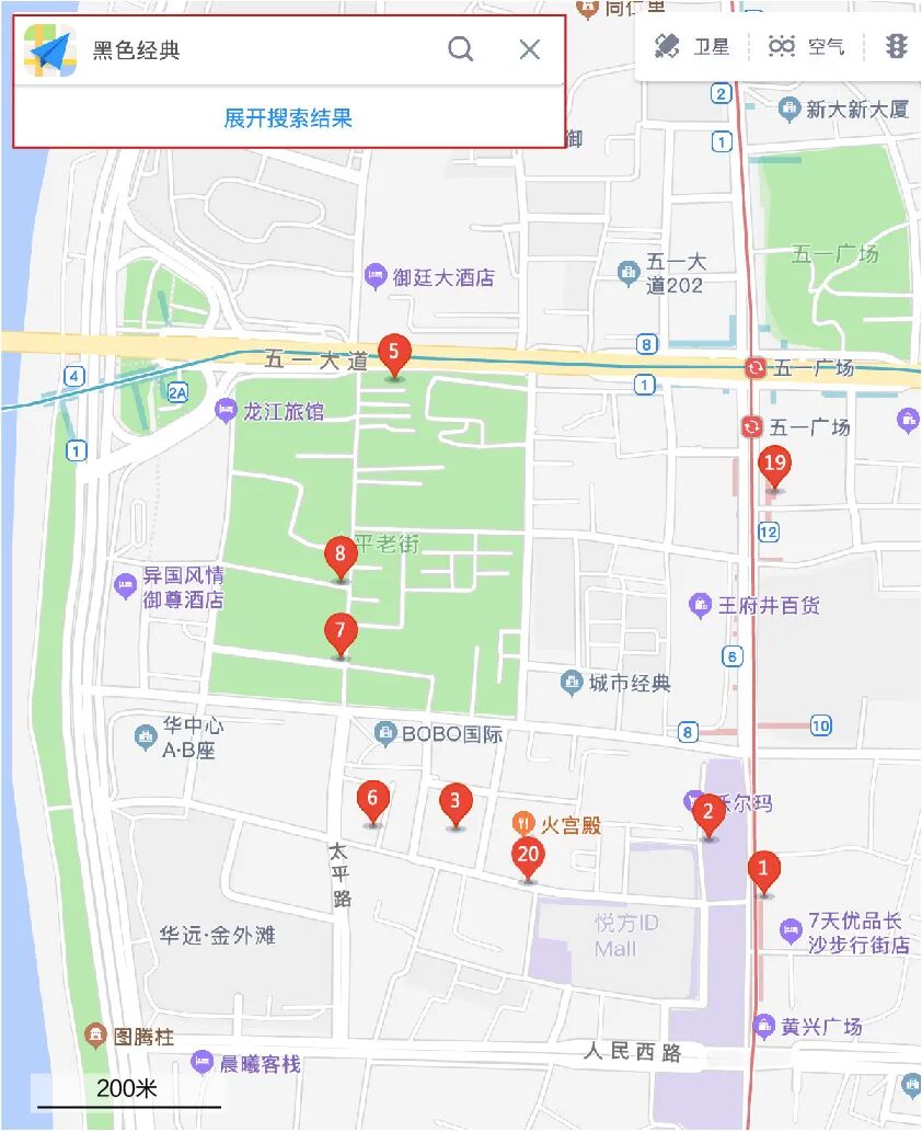 比如当你站在五一广场想吃一份黑色经典臭豆腐,搜索地图会发现,自己早就被十几家黑色经典包围。