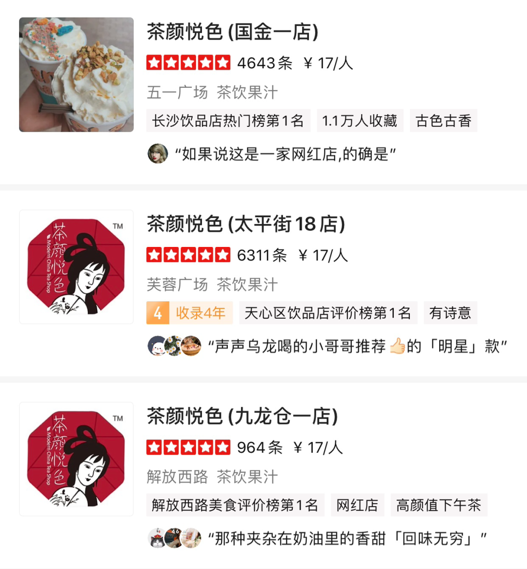 在微博上搜索茶颜悦色,你会看到外地人对它的夸奖,也会看到本地人的自豪。但对于茶颜悦色的褒奖不止是在社交平台上,本地生活软件上,用心给它打Call的顾客也不在少数。这大概就是大多数茶颜悦色门店都无限接近满分的原因。