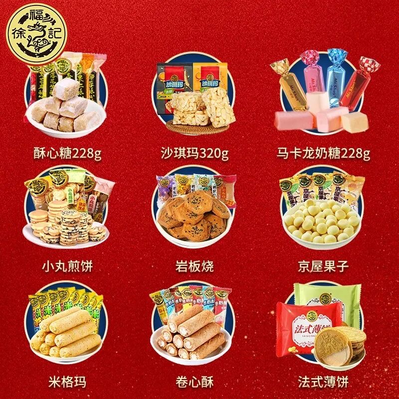 内配多款糖果饼干,每一款都是徐福记人气零食!20多年匠心传承,沙琪玛、酥心糖、卷心脆、米格玛、小丸煎饼,法式薄饼……蛋香浓郁,老少皆宜!每款零食背后都藏着你和家人的珍贵回忆!