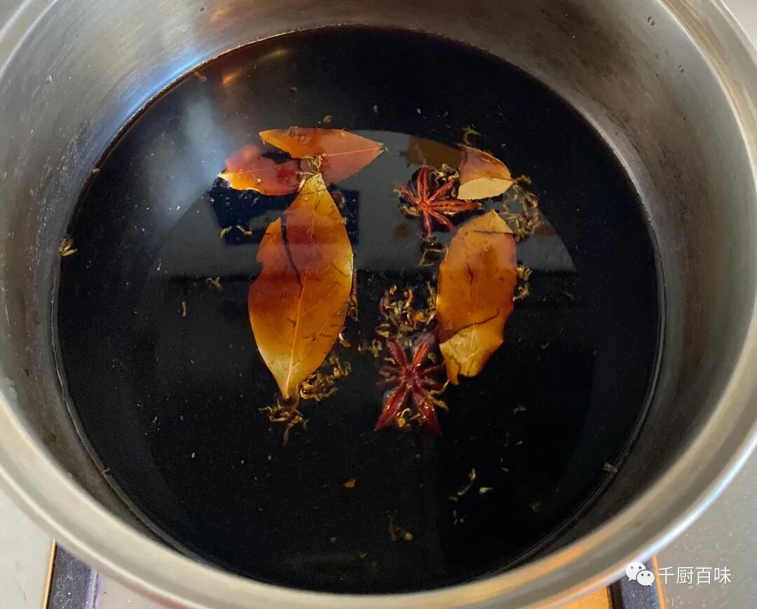 锅里倒水,放入生抽增鲜,老抽上色,再加入适量的盐和糖,可以尝一尝味道,再放入刚刚准备好的4种调料增香,大火烧开后,关火焖两分钟,泡出茶叶香。这时候,已经满屋子飘香了。