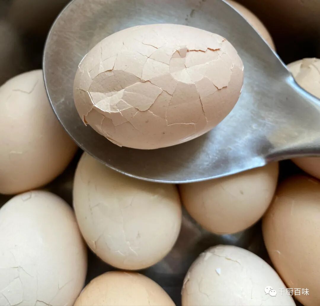 然后拿一个大的不锈钢勺把鸡蛋依次敲一遍,轻轻的敲出裂纹,每个鸡蛋都要仔细的敲一遍。