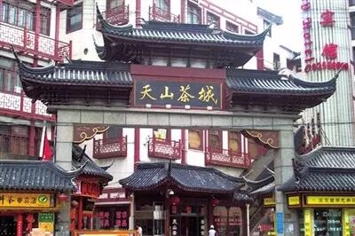 天山茶城是典型的明清建筑风格,主建筑采用梁柱式结构,凸出了梁、柱的直接结合,减少了斗拱这个中间层次,使得整个茶城显得简练、严谨。天山茶城建筑面积有23000平方米,内有商铺400余个,经营范围涵盖茶叶、茶具、古玩字画、茶文化传播等,其中一楼以茶叶销售为主,二楼经营茶具,三楼经营与茶有关的古玩、字画等。2002年开业以来,先后被海内外几十家媒体报道,被上海市旅游协会批准为“接待旅游团体推荐单位”。
