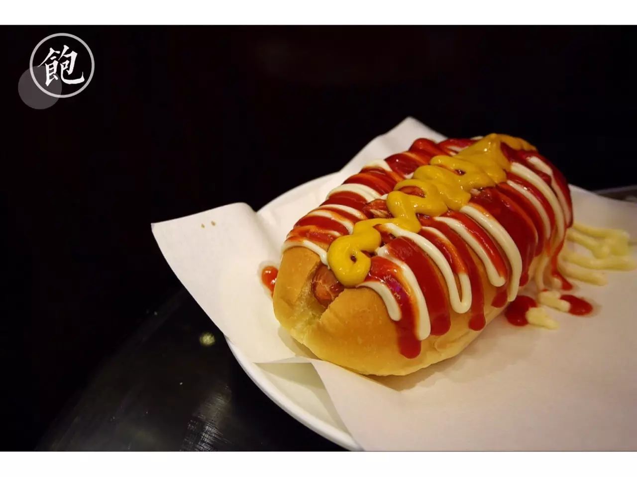 大热狗上淋满番茄酱,沙律酱,芥末酱,满足感咻咻咻!