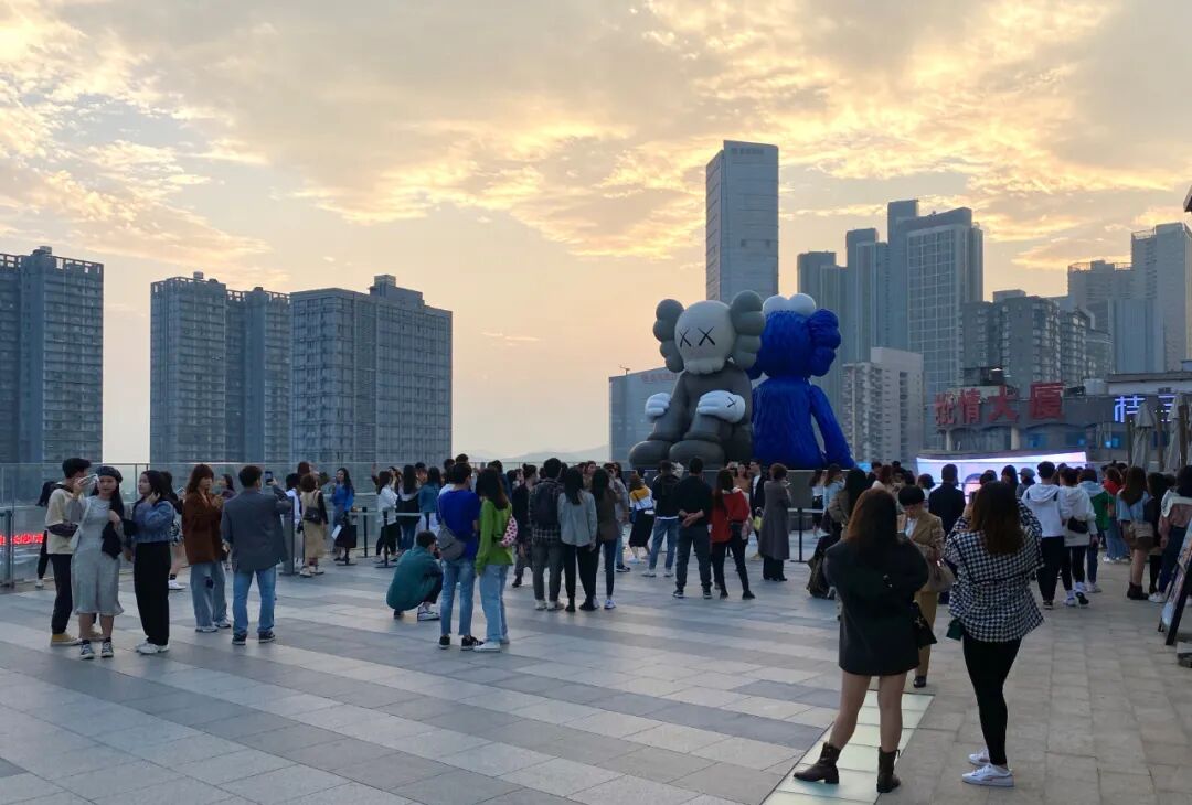 图 / 工作日上午,在谢子龙影像艺术馆门口聚集拍照的年轻人。图片为作者拍摄。在长沙,不会拍照的保安不是好摄影师。国金中心七楼的KAWS公仔装置也是热门打卡点,游客们排起长队,保安一边维持秩序,一边熟练接过手机为游客拍照。