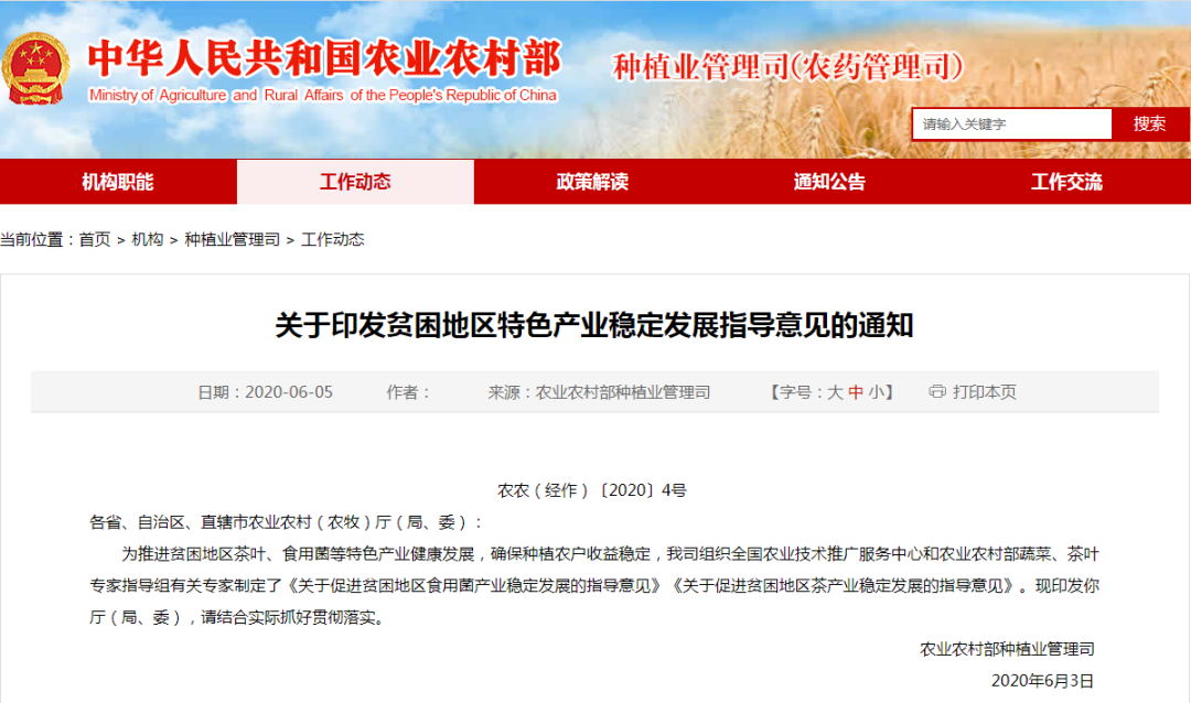 6月3日,农业农村部种植业管理司发布《关于印发贫困地区特色产业稳定发展指导意见的通知》。