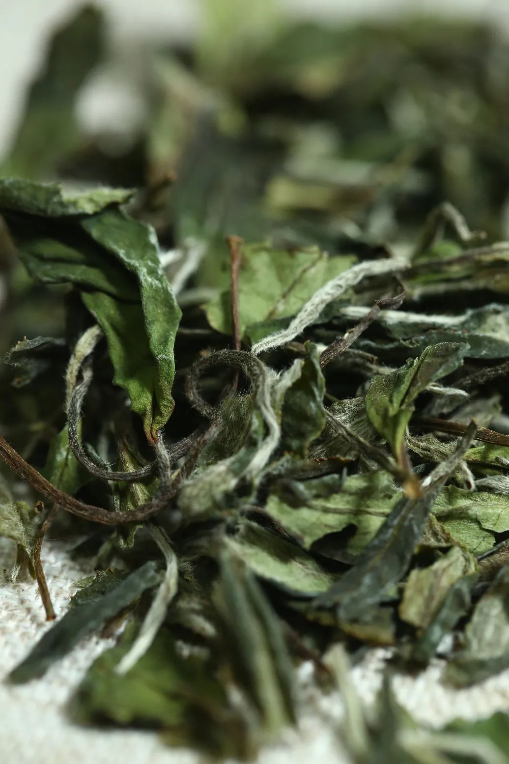 白茶大多灰绿,表面附着白毫,茶汤多数鲜醇爽口。它与绿茶不同,绿茶不发酵,茶汤入口刺激性相对强些;它与普洱茶有一点相似,可以多年存放,存放过程中茶叶中的内含物质会缓慢转化。