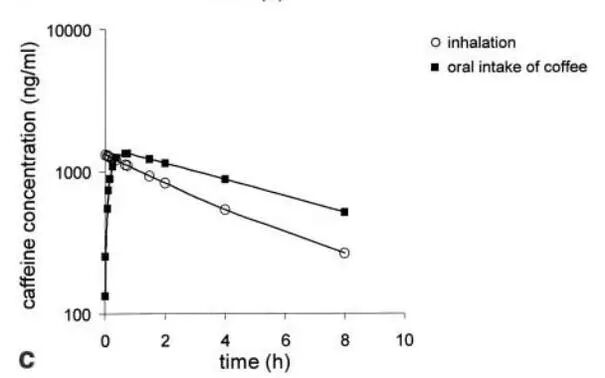 另外,我居然还真找到论文在讲咖啡因吸入的代谢动力学……据说,吸入咖啡因的生物利用度有60%。下面的图是吸入100mg咖啡因和喝一杯咖啡之后体内咖啡因变化的一个对比: