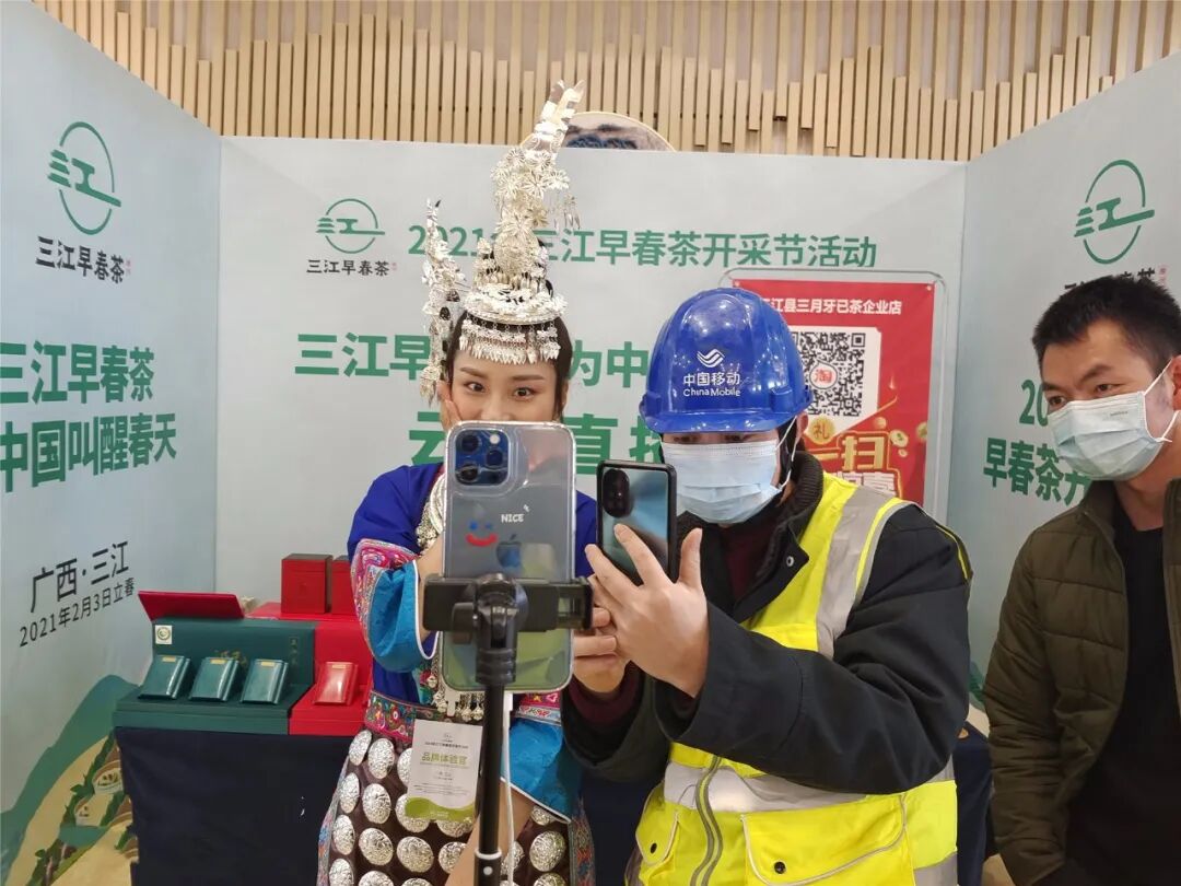 近日,移动人来到2021年三江早春茶开采节活动现场,深入茶田,开展网络测试、调整基站天线方向角等立体优化,并驻守活动现场进行紧密监控。在流畅无卡顿的移动网络加持下,视频直播、主播带货、一键下单······直播间里订单不断,好不热闹,一捧茶让山水茶园成为侗族乡亲的幸福家园。
