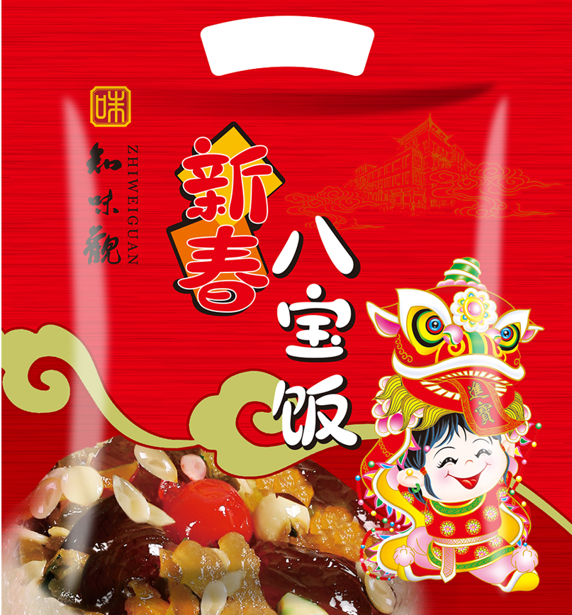吃法:去内包装袋后放入微波专用盛器,在八宝饭表面淋适当洁净饮用水后,加盖保鲜膜高火加热5-7分钟,或去内包装袋中火隔水蒸制25-30分钟即可食用。