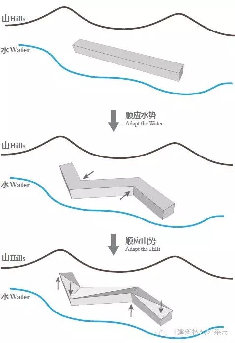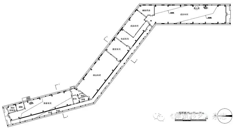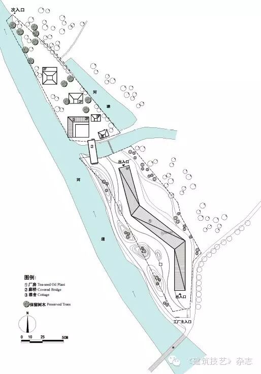 扩容后的厂房长160m、宽12m,高度因车间而异。在不影响工艺流程的前提下,我们把它折成“之”字形和连续不同的斜坡顶,以顺应地形河流的走向及远方山脉的轮廓,最大限度地解决了第一个问题。此外,在设计过程中,通过解释与说服,弱化了第二个问题,最终以实际效果赢得了业主和各级政府的好评。