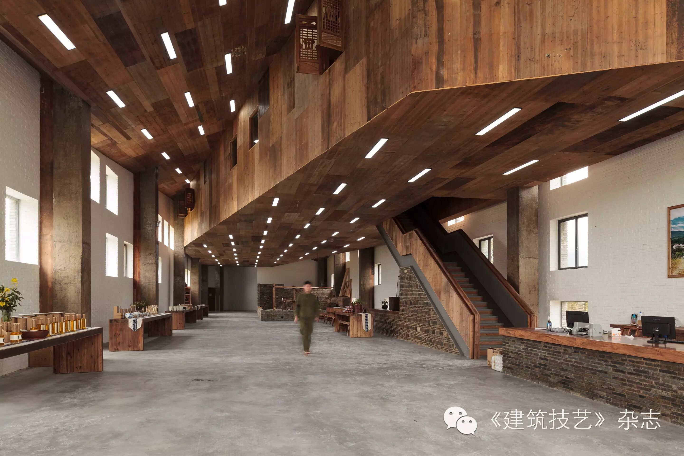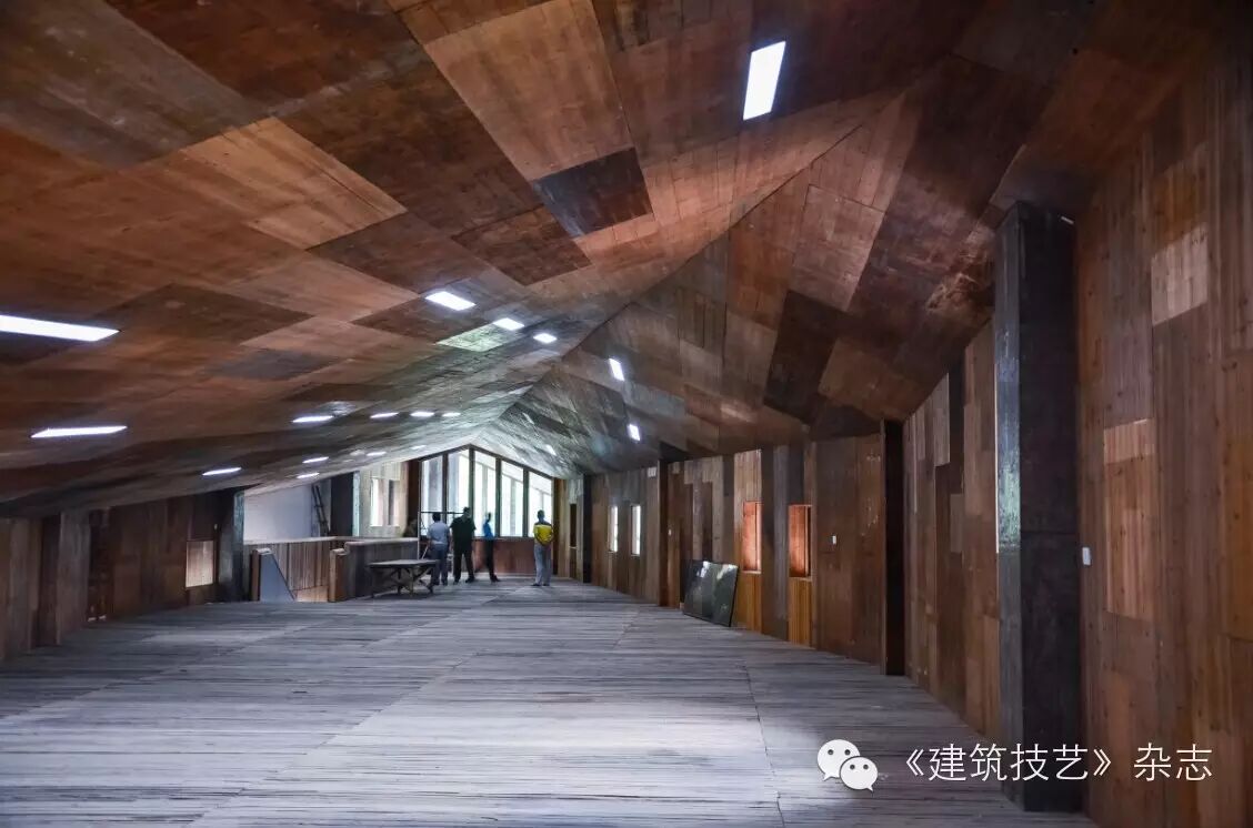 旧门板用在吊顶、夹层墙体和楼板等处,和旧砖一样只做必要的清洗分类,保留原有痕迹。个别门板还有门神、文革标语等,历史信息丰富。门板施工也采用最简单的构造手法,长边沿建筑长边错缝铺装,无论吊顶、墙体、楼板,平面、斜面均采用同一方式由工人自己随机拼贴,简单中透着丰富。吊顶上的日光灯管也按此原则错位布置。