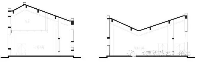厂房看似复杂,其实东西立面和南北立面两两分别是对称关系,逻辑上简单明了。东立面均为1.3m×1.3m方窗,西立面自南向北依次为1.3m×1.3m方窗、2.1m×2.1m方洞、1m×1m洞和窗,以应对不同的功能要求。成品兼陈列车间位于南侧,采用落地玻璃;仓库位于北侧,以实墙砌筑;东西两侧均为长边,为避免过量的直射光,按采光计算对窗洞做有控制的随机布局。这种因功能而产生的开窗形态与当地民居群落呈现的窗洞布局有一种不经意的相似。