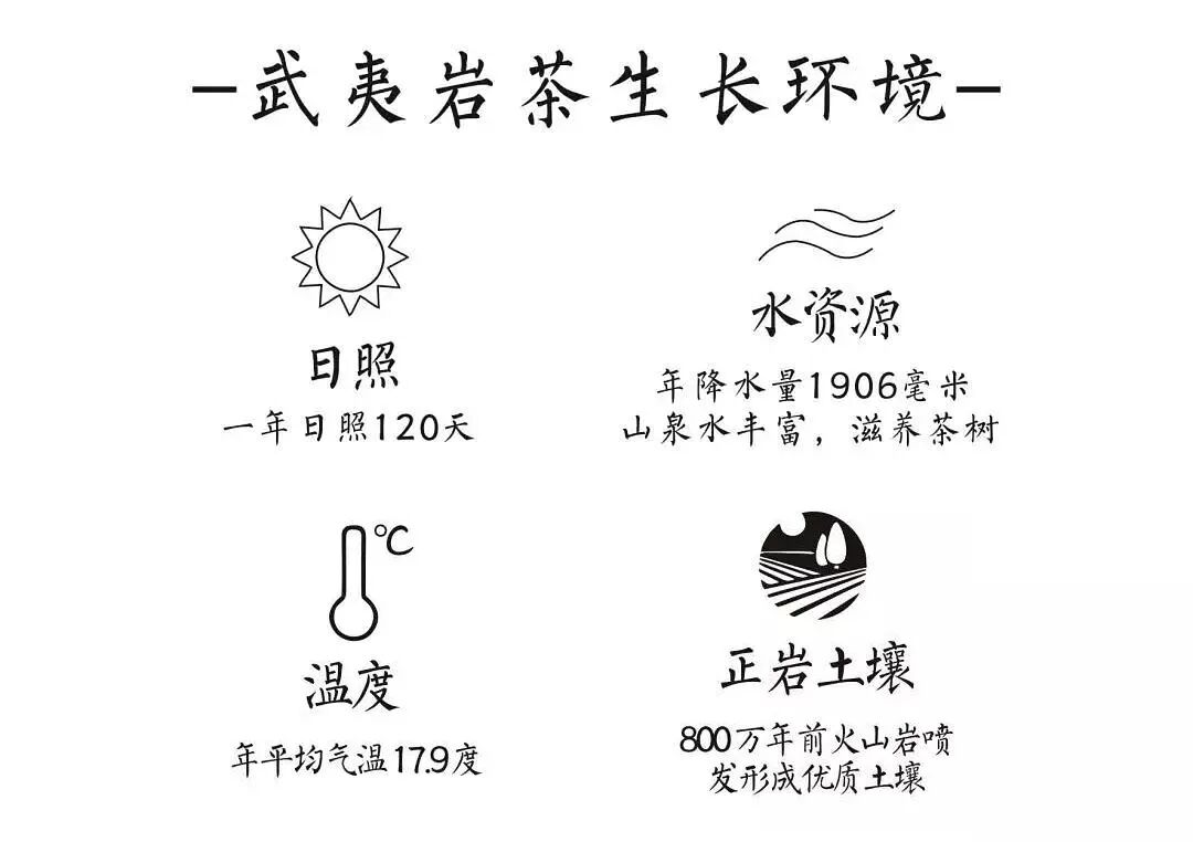 武夷岩茶区,气候温和,冬暖夏凉。山峰岩壑之间,有幽涧流泉,山间常年云雾弥漫。正如沈涵《谢王适庵惠武夷茶诗》云:“香含玉女峰头露,润滞珠帘洞口云”。茶园大部分在岩壑幽涧之中,四周皆有山峦为屏障,日照较短,更无风害。优越的自然条件孕育出岩茶独特的韵味。