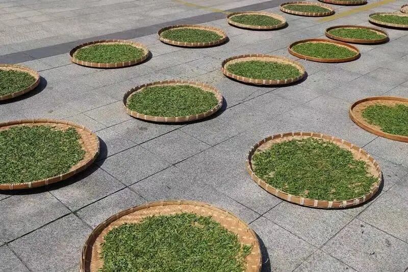 (1)萎凋。将鲜叶摊置晒簟(diàn,释义:竹席)上,晒至暗绿色,叶边呈褐色,叶柄柔软,折之不断时为适度。萎凋是“祁红”初制首要的关键工序,是奠定“祁红”条索细紧美观、香高味醇的基础。