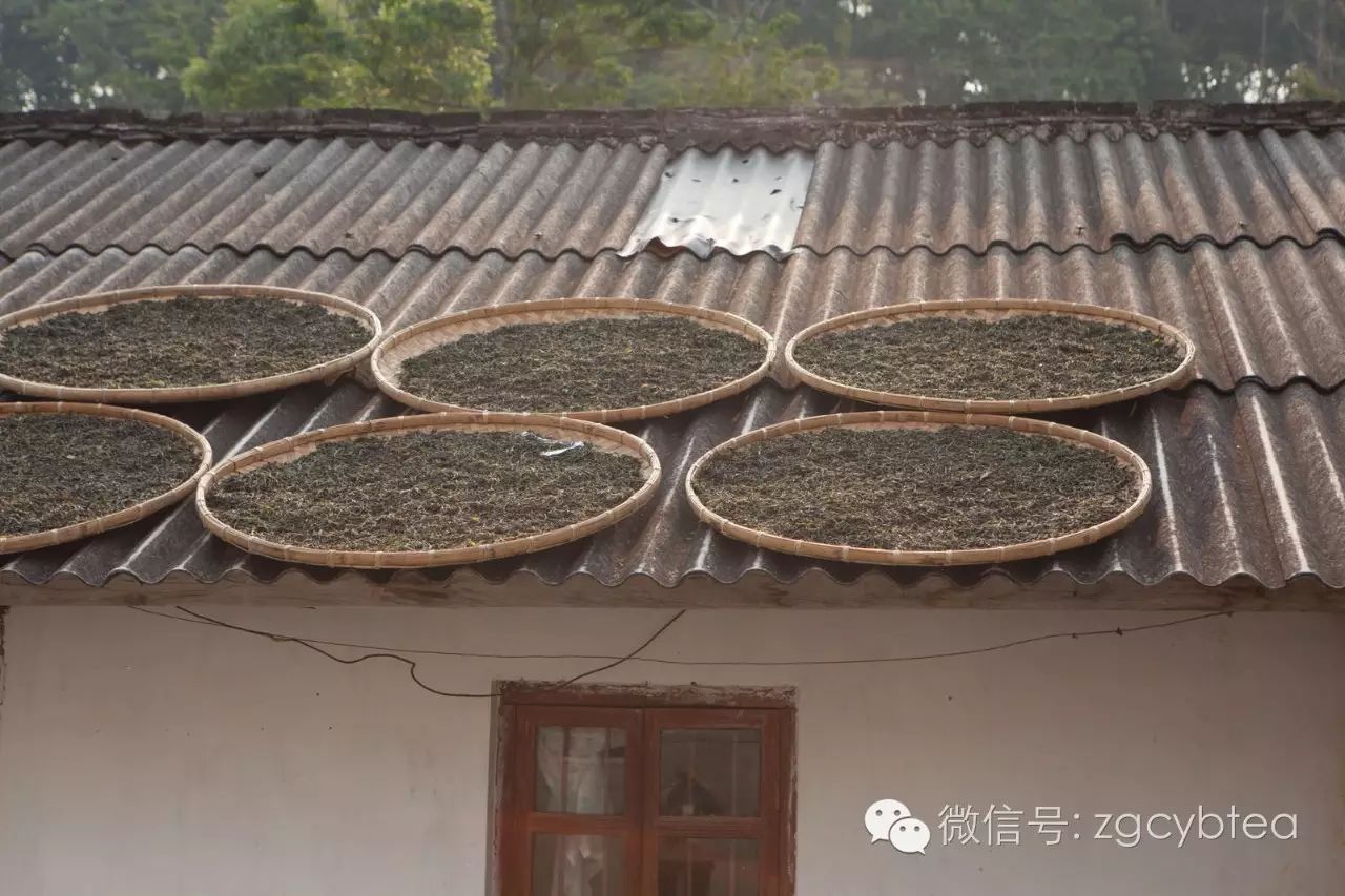 前一晚炒制好的茶叶已经摊晾许久,易武早上8~9点钟的太阳已经急不可耐地将热量洒满屋顶和屋外的空地。铺满茶叶的竹匾被一一送到屋顶和屋外的空地,尽情享受着光线的照耀,蒸发多余的水分。